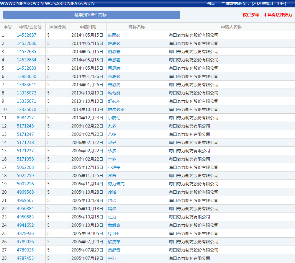??谄媪χ扑幑煞萦邢薰臼呛D鲜♂t(yī)藥生產(chǎn)企業(yè)、國家高新技術(shù)企業(yè),“2018年度中國化藥企業(yè)TOP100排行榜”第65位。旗下可檢索到108件商標(biāo),多集中在第5類-醫(yī)藥,2014年之后暫無新注冊商標(biāo)。