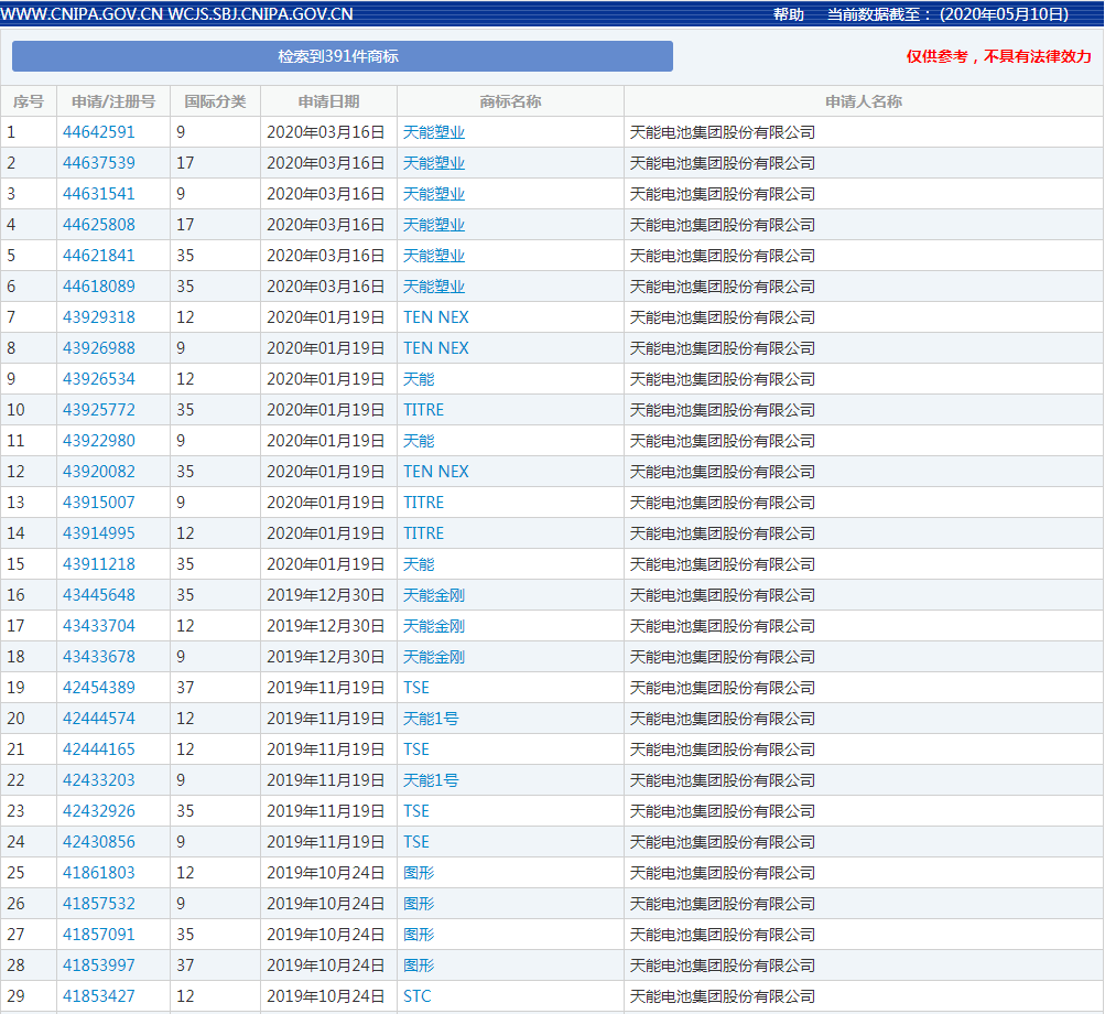 天能集團,中國動力電池生產(chǎn)商,成立于1986年,地處浙江長興。2007年在香港聯(lián)交所主板上市,入選2019中國品牌強國盛典榜樣100品牌。旗下有注冊商標(biāo)391件。