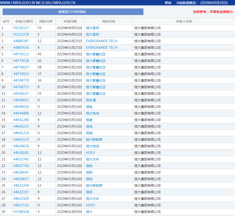 恒大成立于1996年,以民生地產(chǎn)為基礎(chǔ),文化旅游、健康養(yǎng)生為兩翼,新能源汽車為龍頭的世界500強企業(yè)集團。旗下有注冊商標(biāo)2559件。
